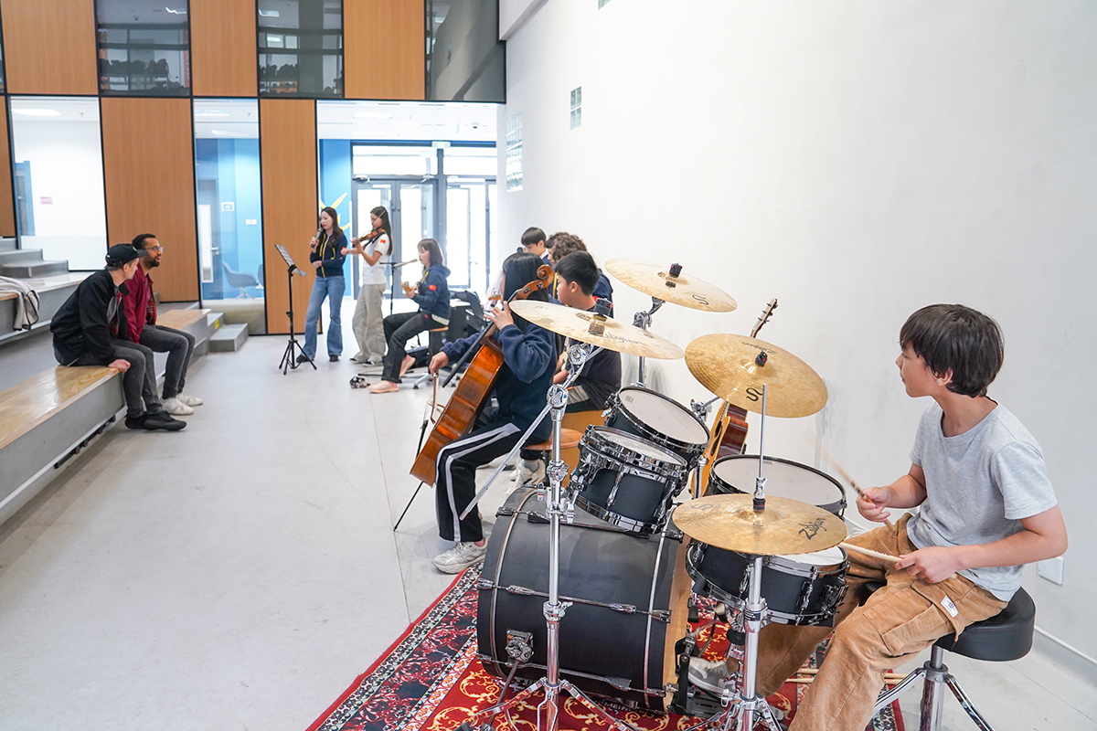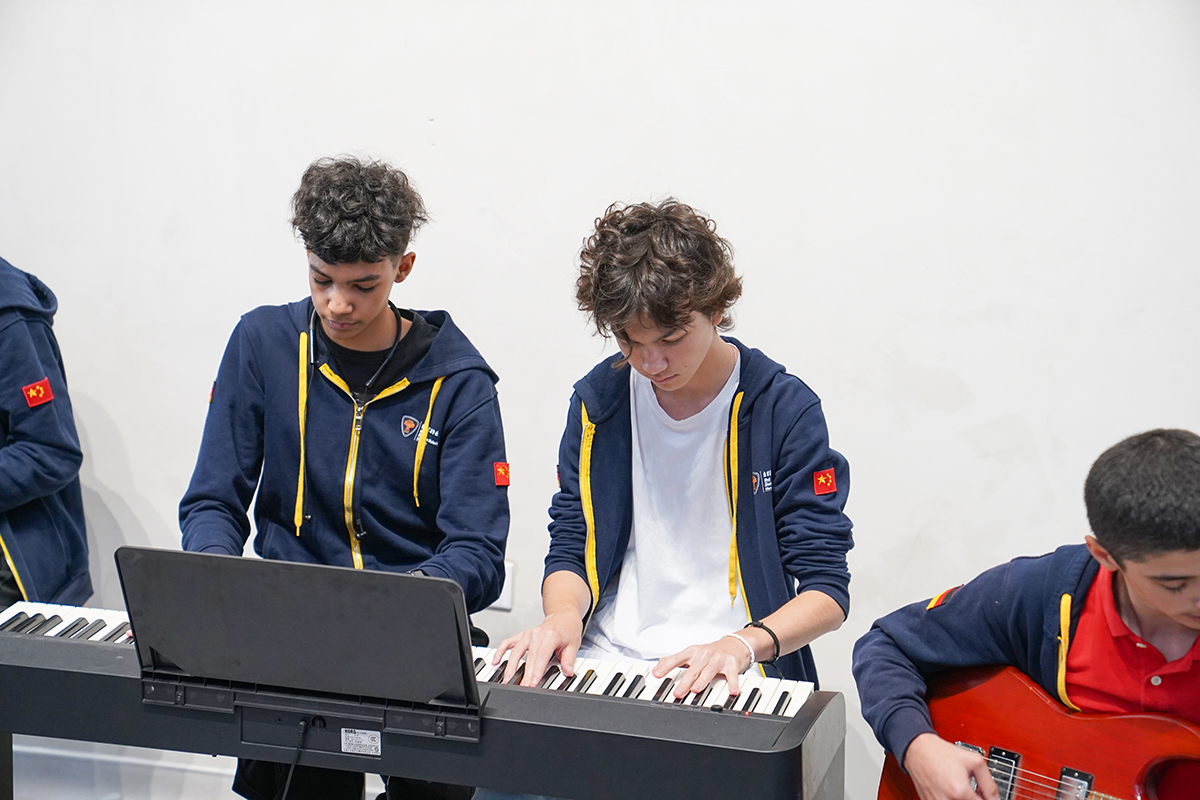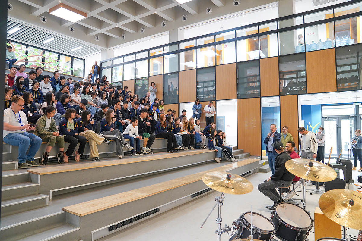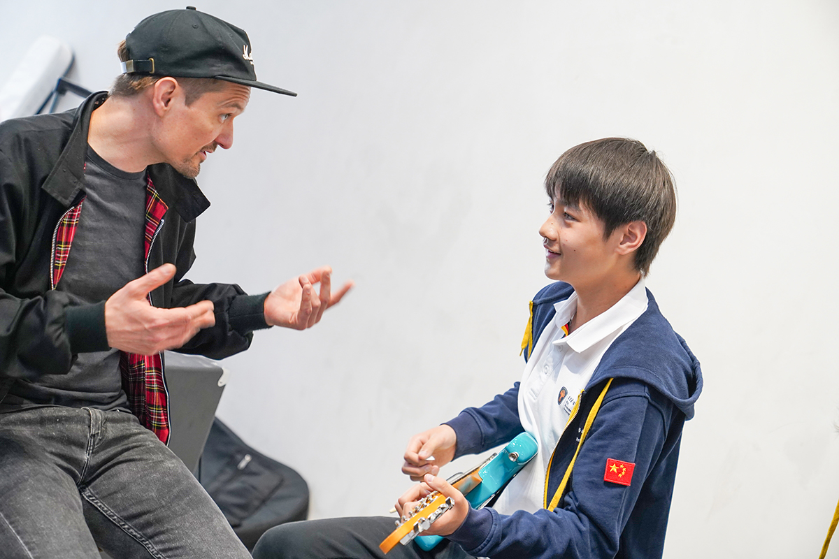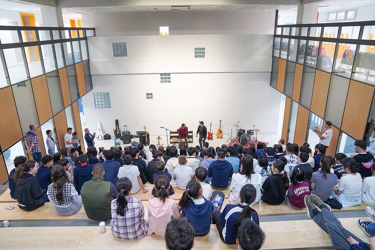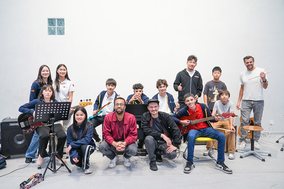 Auch die Schüler*innen präsentierten beeindruckende Beiträge aus dem Schulorchester und stellten viele Fragen rund um Musik. Philipp und Lukas beantworteten diese geduldig, demonstrierten Spieltechniken live und zeigten, wie man musikalische Emotionen besser ausdrücken kann. In einer entspannten und fröhlichen Atmosphäre überbrückten zwei Generationen von Musikern Alters- und Landesgrenzen – vereint durch die gemeinsame Liebe zur Rockmusik – und führten einen intensiven, inspirierenden Austausch.