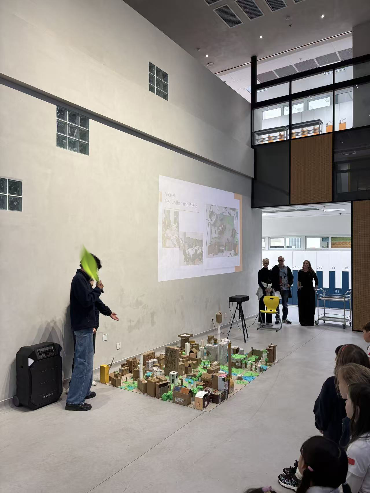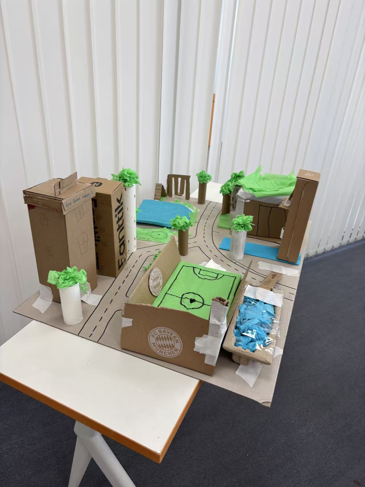Der Wertetag war in mehrere aufeinander aufbauende Blöcke gegliedert. Zu Beginn gestalteten die Schülerinnen und Schüler in altersgemischten Gruppen ihre Dorfbereiche. Mit viel Fantasie, Farbe und Liebe zum Detail entstanden individuelle Viertel, die jeweils eigene Schwerpunkte hatten – und doch harmonisch zusammenpassten. Straßen, Gebäude, Plätze und Symbole machten sichtbar: Jedes Viertel ist einzigartig, aber nur gemeinsam wird daraus ein funktionierendes Dorf.