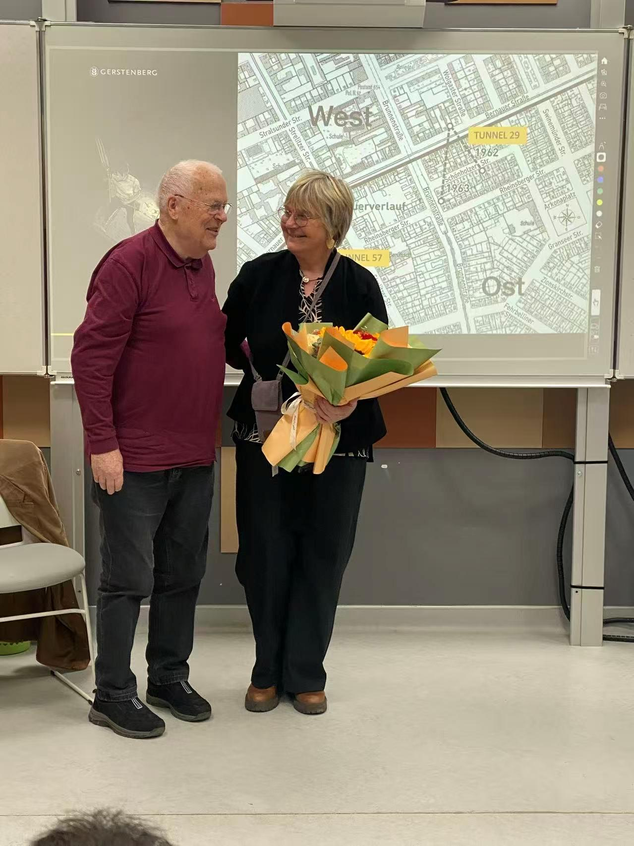 下午的活动则迎来了一个特别的高潮。在较高年级学生、家长和教师面前,历史亲历者JoachimNeumann讲述了一段惊险的德国历史——从西柏林通往东柏林的地下隧道建设。他与伴侣Maja Nielsen 共同分享的亲身经历,让那段历史以震撼而真实的方式重新呈现在大家眼前。